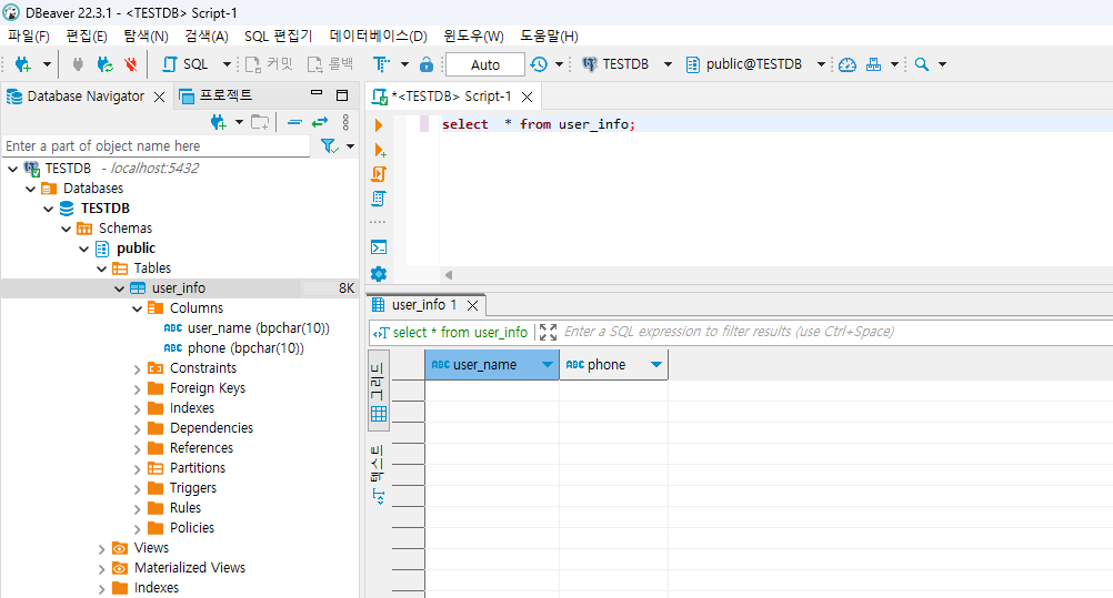 DB유형을 Postgresql로 선택하고 생성한 TESTDB에 접속 후 user_info테이블이 생성된 부분을 확인 할 수 있습니다.