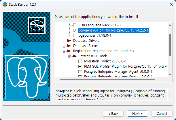 추가로 필요한 부분을 설치합니다. pgAgent와 Sql Profiler Plugin을 추가해서 설치를 하도록 하겠습니다