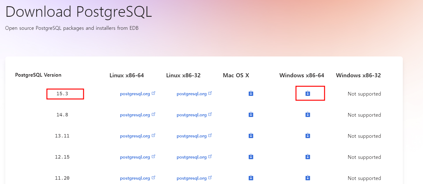 - 먼저 아래사이트에서 OS버전에 맞게 다운로드를 합니다. 윈도우에 설치할 예정이여서 PostgreSQL 15.3버전을 윈도우에 설치해보겠습니다.