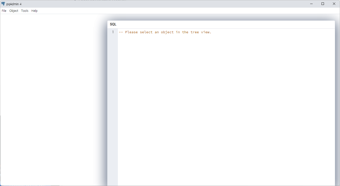 pgAdmin4화면을 Remove Panel등 실수로 삭제를 했을때 아래화면과 같이 DB연결화면이 나오지 않는 경우가 있습니다. 이때 최초 설치된 UI로 리셋하는 방법입니다.