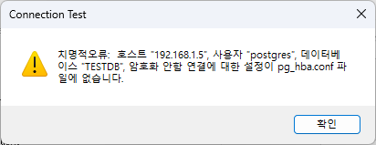 postgresql을 설치 후 외부에서 접속을 활성화 하기 위해서는 pg_hba.conf파일의 정보를 변경해야 합니다. 해당부분을 변경하지 않을경우에는 아래와 같이 "암호화 안함 연결에 대한 설정이 pg_hba.conf 파일에 없습니다" 라는 오류가 발생합니다.