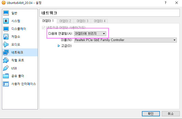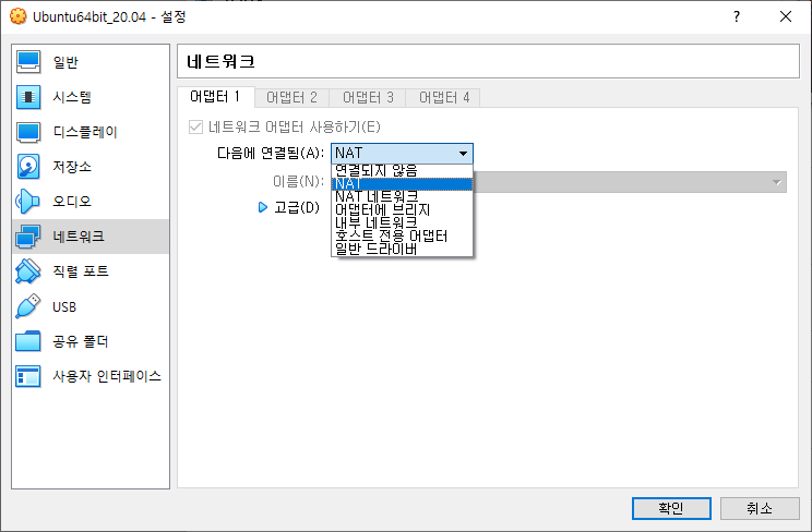 설정메뉴-> 네트워크 -> 어댑터1항목을 살펴보도록 하겠습니다. 아래와 같이 NAT,NAT네트워크,어댑터에 브리지등의 항목이 있습니다.
