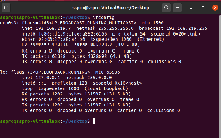 터미널에서 ifconfig명령으로 아이피정보를 확인해보면 10.0. 대역의 사설IP대역을 사용하는것을 확인할수 있습니다. 윈도우가 설치된 HOST PC의 경우 ipconfig명령으로 확인해보면 192.168대역의 사설IP를 사용하는것알수 있습니다.