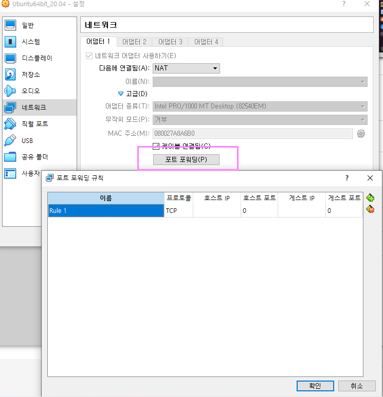 포트포워딩의 경우는 아래그림과 같이 고급(D)항목을 펼쳐서보면 포트포워딩 메뉴가 나타나며 호스트IP,PORT 게스트IP,게스트포트를 지정하면 됩니다.