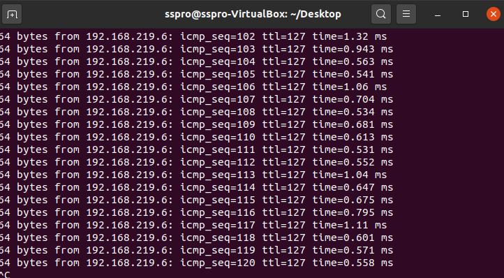 NAT로 구축을하면 아래그림과 같이 Ping테스트를 해보면실제 게스트<->호스트간의 네트워크가 연결이 된것을 확인할수 있습니다. 이렇게 하여 연결이 가능합니다. 다만 NAT로 구축을 할경우에 ssh,putty등으로 외부에서 접속이 필요한경우에는 포트포워딩을 해줘야하는 번거로움이 있습니다.
