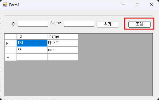 프로그램을 실행 후 테스트를 해보면 id,name에 값을 입력후 추가하면 UserInfo테이블에 데이터가 저장되고, 조회버튼을 클릭하면 데이터를 가져와 Grid에 표출되는 부분을 확인 할 수 있습니다.