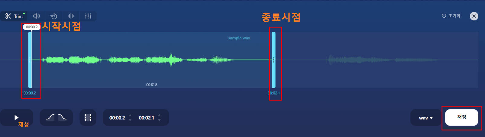 음성파일이 아래와 화면과 같이 나타나며, 하늘색 양쪽 바를 이동하여 음성파일을 잘라나고 싶은 범위를 시작시점 ~ 종료시점을 선택합니다. 재생버튼을 눌러서 짤라낸 음성을 들어 볼 수 있습니다.