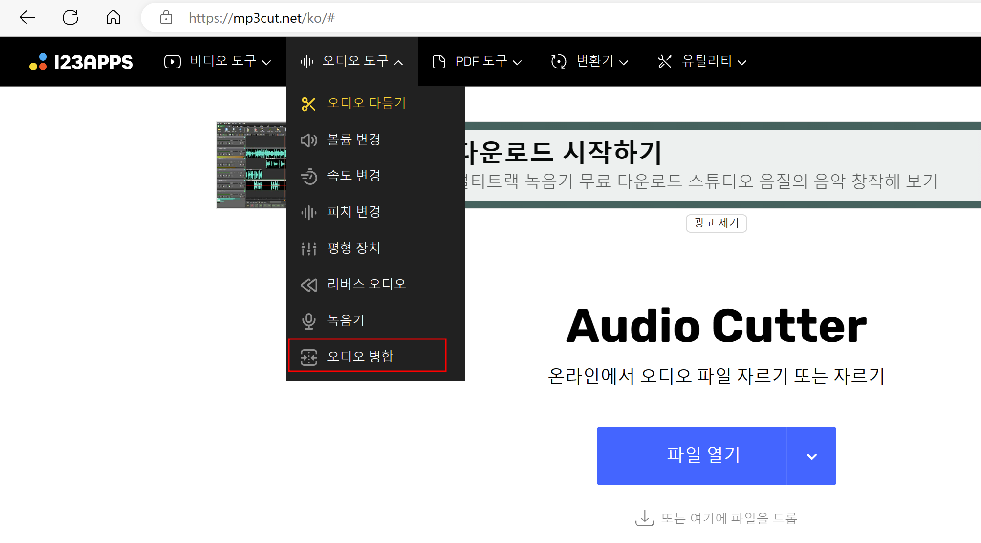 1. 오디오 커터 홈페이지(https://mp3cut.net/ko)에 접속합니다.
