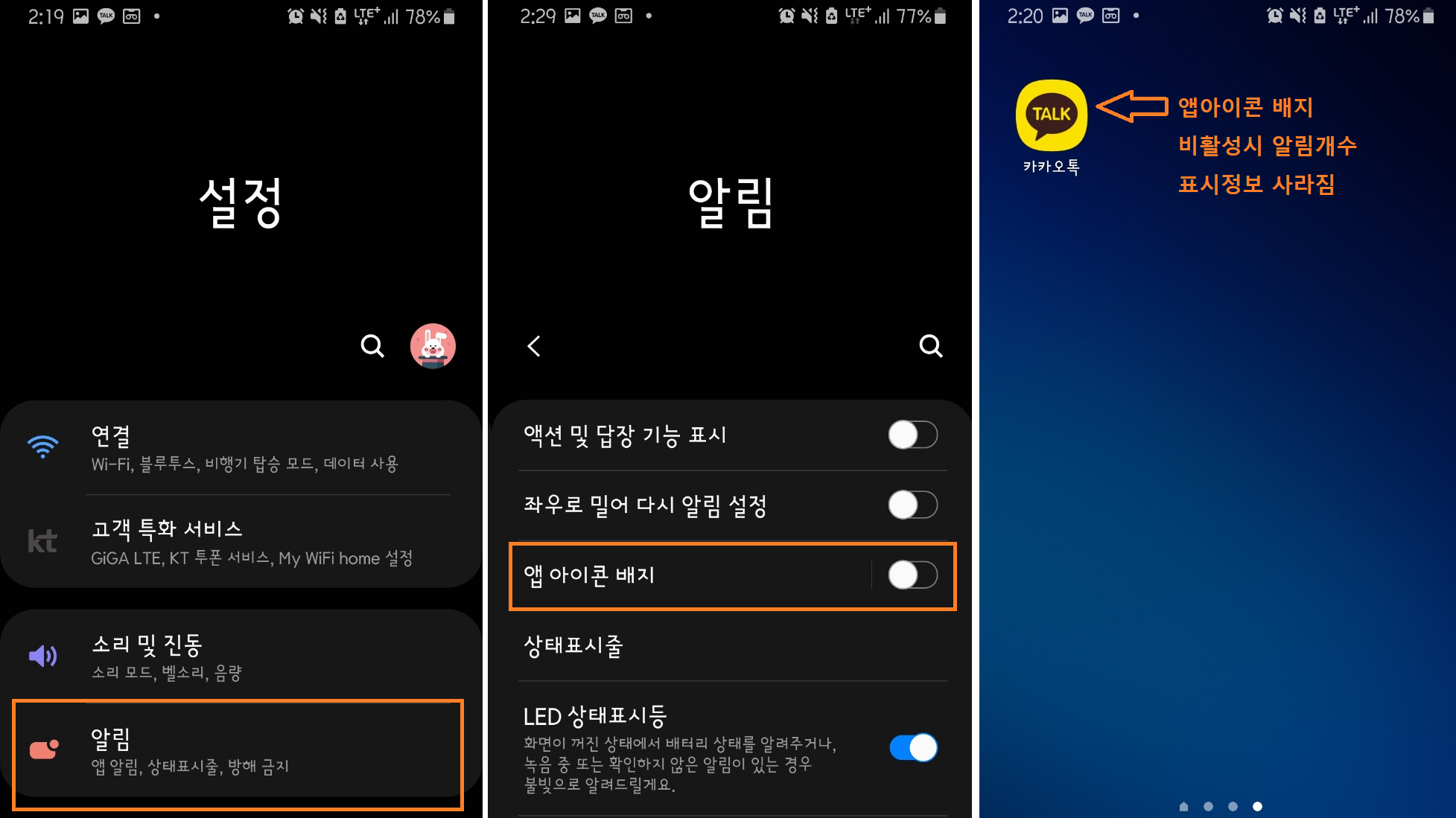 안드로이드폰을 사용할때 알람이 왔을때 아이콘에 몇개의 알림이 왔는지 숫자가 표시가 됩니다. 숫자정보를 표시를 하지 않고 싶은 경우가 있습니다. 이 경우에닌 배지설정을하여 알림 개수 보이기를 활성화 비활성화 할 수 있습니다. 초창기에는 앱자체에서 구현해주는 기능알았는데 안드로이드 OS에서 알림에 대한 설정입니다.