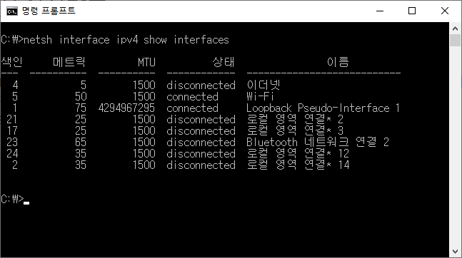 도스창에서 "netsh interface ipv4 show interfaces" 명령을 실행합니다. 해당명령을 실행하면 MTU값이 어떻게 설정되어있는지 확인할수 있습니다. 1500으로 설정된것을 확인할수 있습니다.