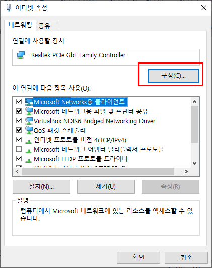 2. 제어판->네트워크 및 공유센터->네트워크 연결설정에 이더넷 속성 -> 구성을 클릭합니다.