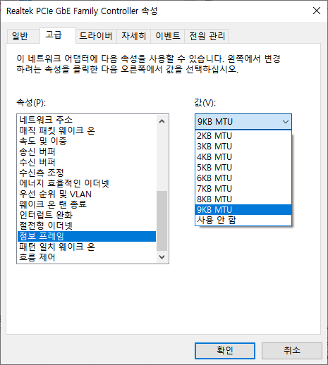 고급탭 -> 속성(P)항목중 점보프레임 선택 -> 값 : 9KB MTU 설정