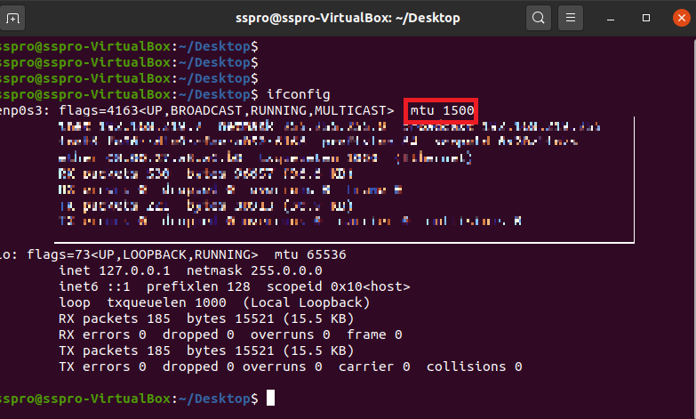 ifconfig명령으로 확인해보면 mtu값이 1500인것을 확인할수 있습니다. 기본값은 윈도우와 동일합니다.