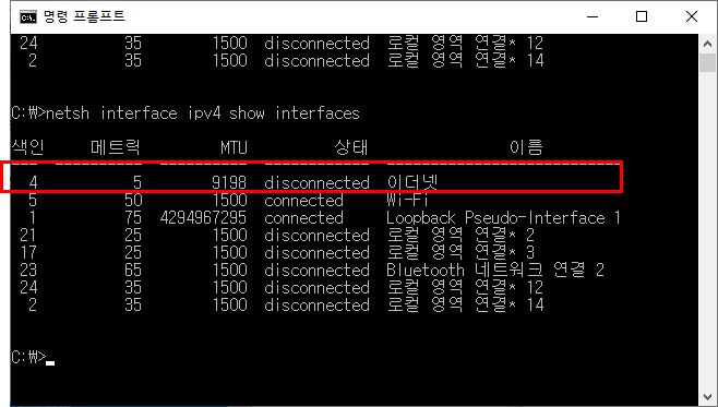 netsh interface ipv4 show interfaces 명령으로 다시 확인해보면 MTU값이 9198로 변경된것을 확인할수 있습니다.
