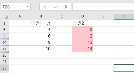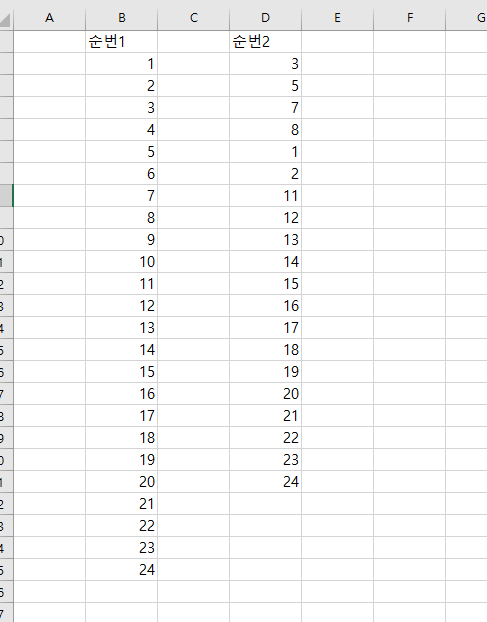 두열의 중복되는 항목을 찾거나 빠진부분을 찾을때 사용하는 방법입니다. 아래 와 같이 순번1, 순번2 열에 서로 다른 숫자값이 있을 경우 순번1에서 순번2번이 없는 항목을 찾고 싶은 경우가 있습니다. 조건부 서식을 사용해서 찾으면 해당부분을 손쉽게 찾을 수 있습니다.