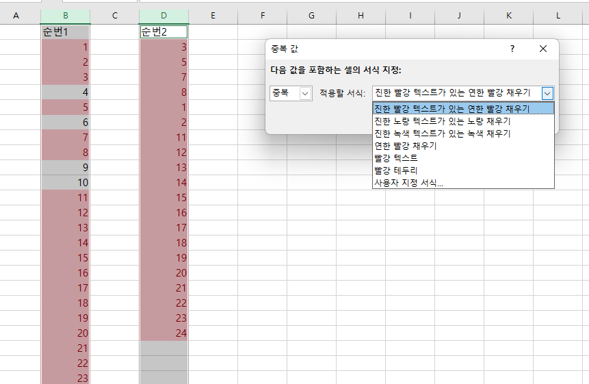 3. 중복값 데이터를 연한 빨강채우기 서식으로 적용