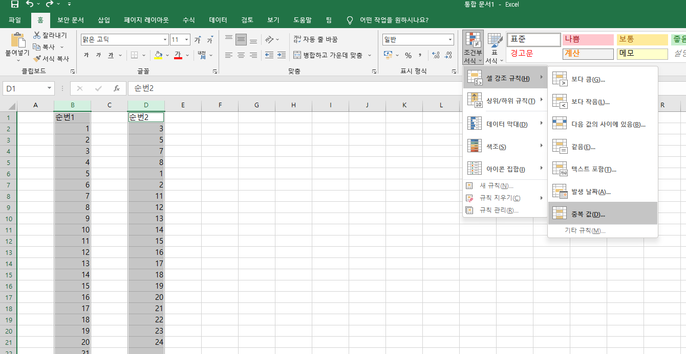 2. 홈 -> 조건부서식 -> 셀강조규칙 -> 중복값 메뉴클릭