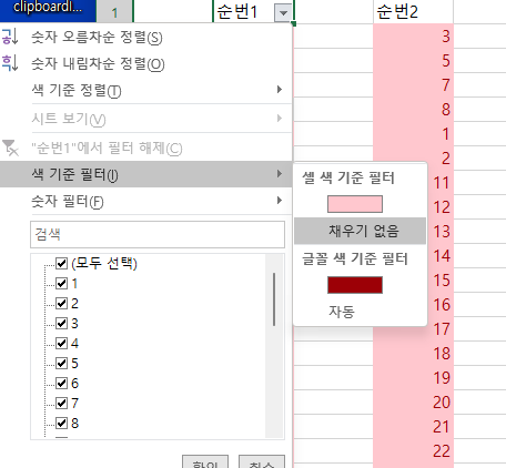 필터 항목에서 색 기준 필터값으로 중복된 데이터를 찾고싶으면 연한 빨간색을 선택하고, 중복되지 않은 열을 찾기위해서는 채우기 없음을 선택합니다.