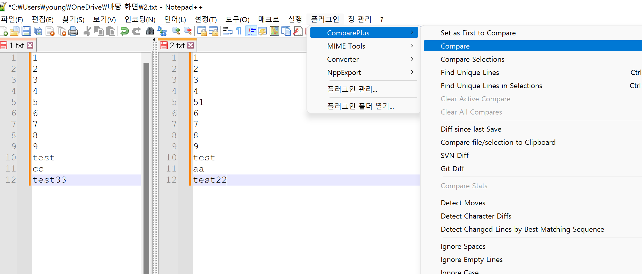 2. 비교하고 싶은 파일 두개를 열고 플러그인 메뉴의 Compare를 선택합니다.