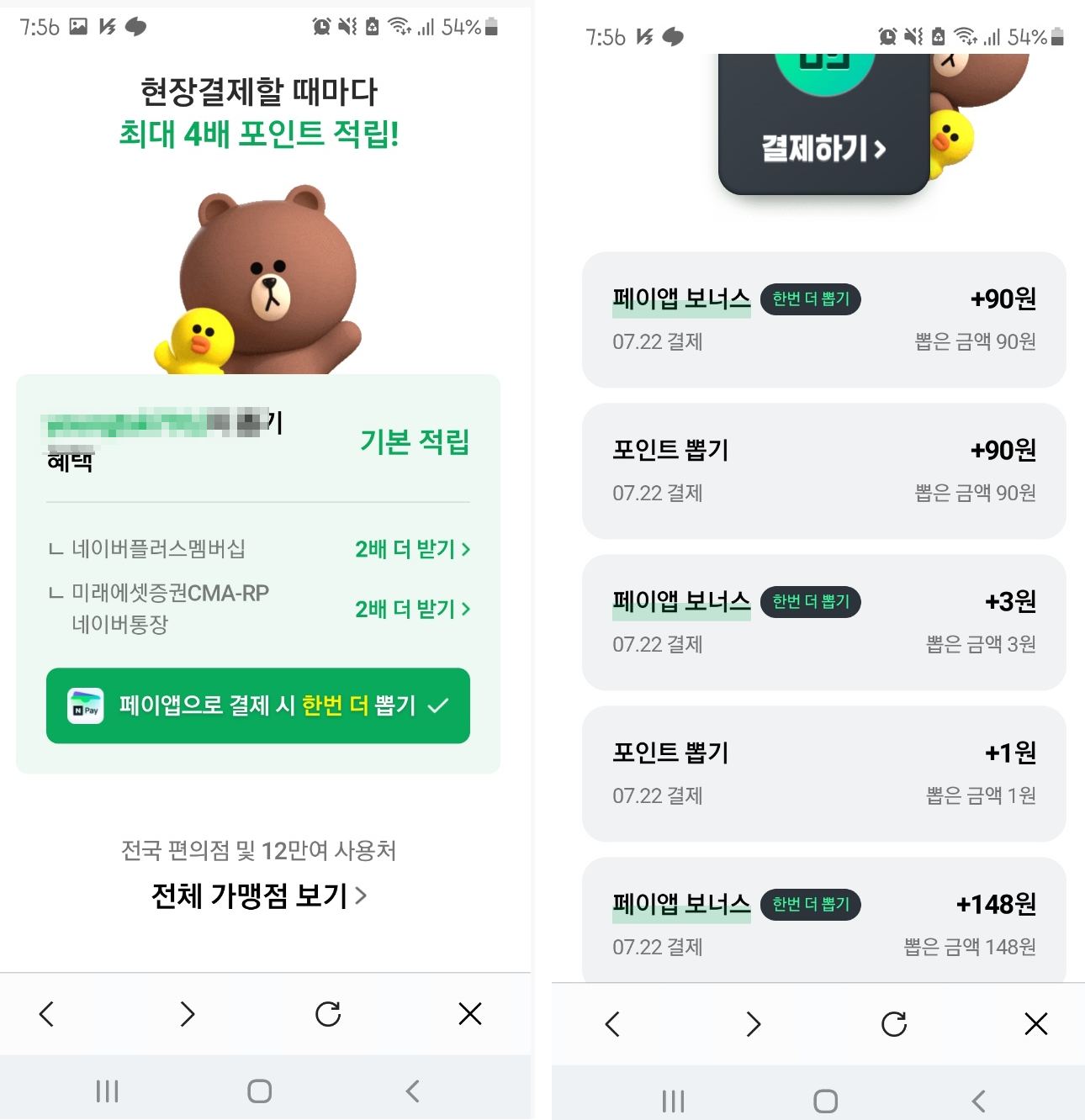 삼성 갤럭시폰을 사용하는 분들은 삼성페이로 결제를 많이 사용을 하고 계시죠? 네이버 페이와 연결하여 사용하면 결제시 포인트뽑기를 통하여 네이버 페이 적립이 가능합니다.결제 건 마다 포인트 뽑기를 통하여 적립이 되니 포인트 모으는 재미가 쏠쏠합니다.
