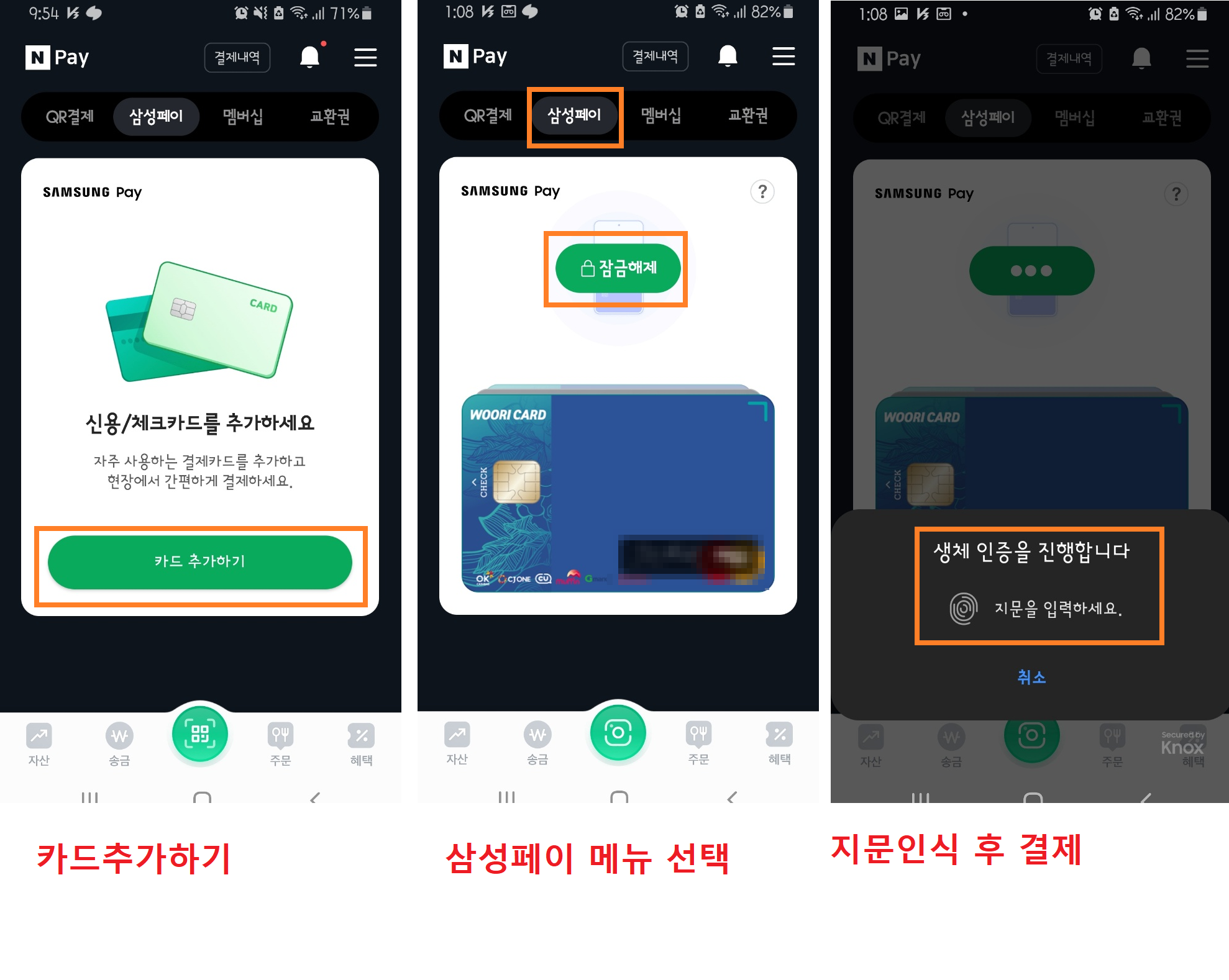네이버페이앱에서 카드를 추가합니다.카드추가 후 에는 기존 삼성페이 결제하는 부분과 동일하게 지문인식을 등록하여 결제 처리를 합니다. 삼성페이 메뉴를 선택 후 잠금해제 버튼을 클릭하면 지문인식 부분이 나타나고 지문인식 한 다음 카드리더깅 터치하면 삼성페이로 결제 처리가 됩니다.