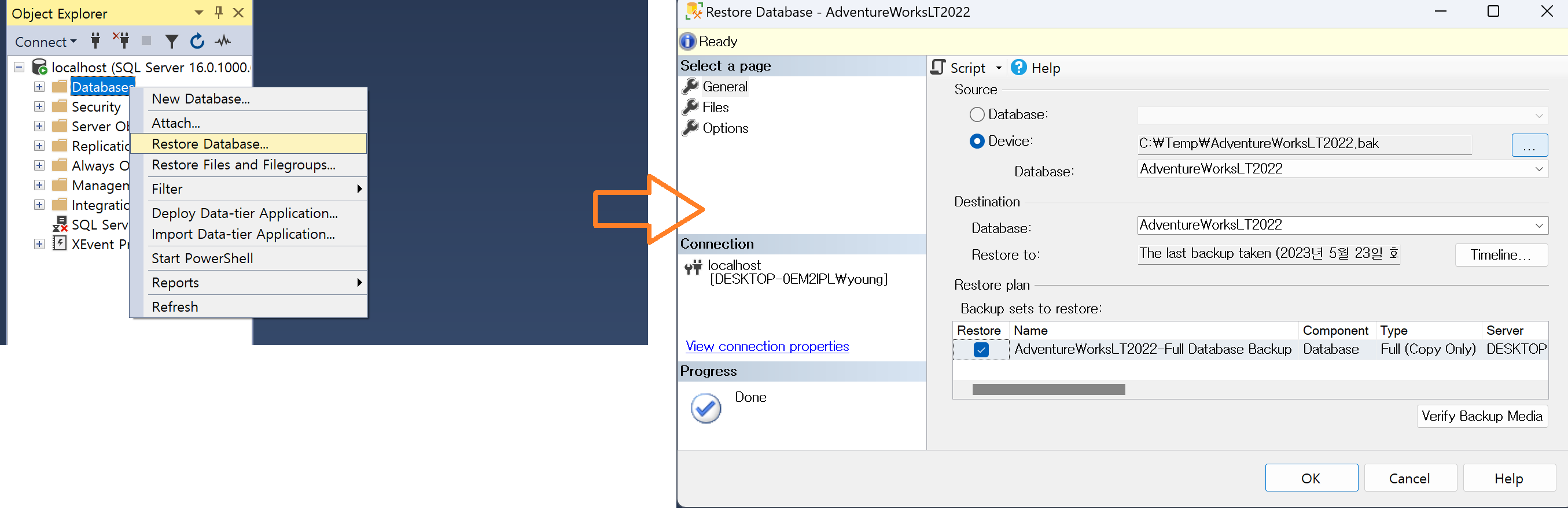 데이터베이스 복구가 되면 아래와 같이 AdventureWorksLT2022 데이터베이스가 복구되어진 모습을 확인 할 수 있습니다.