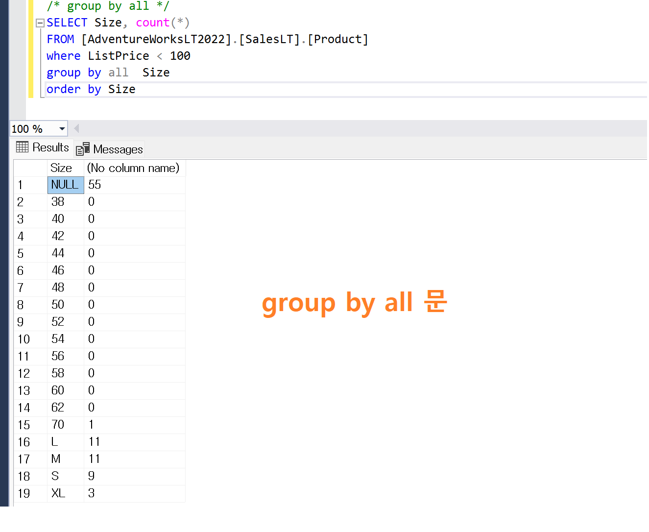 group by all문을 사용하면 where조건에 결과값이 없는 경우에도 항목이 표시되는 부분을 확인 할 수 있습니다.