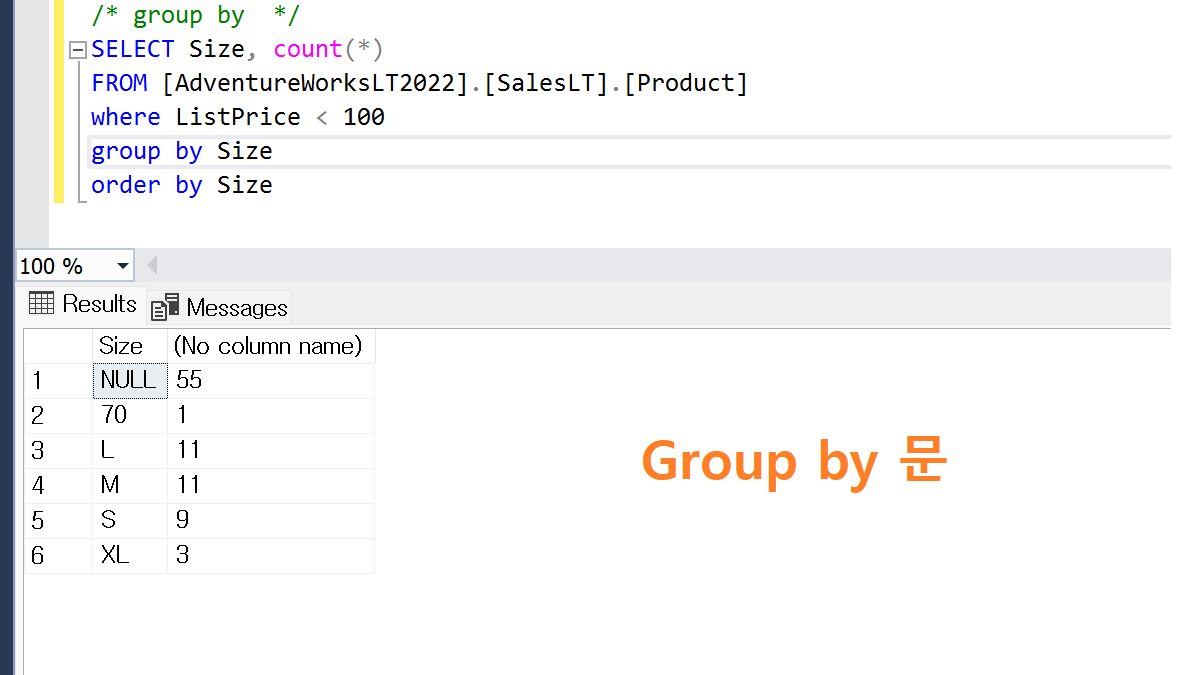 Size값으로 그룹을 지어 몇개의 개수가 있는지 확인 해보겠습니다. group by size로 그룹을 짖고 select문에는 size, count(*)와 같이 개수를 파악할 수 있게 입력합니다.