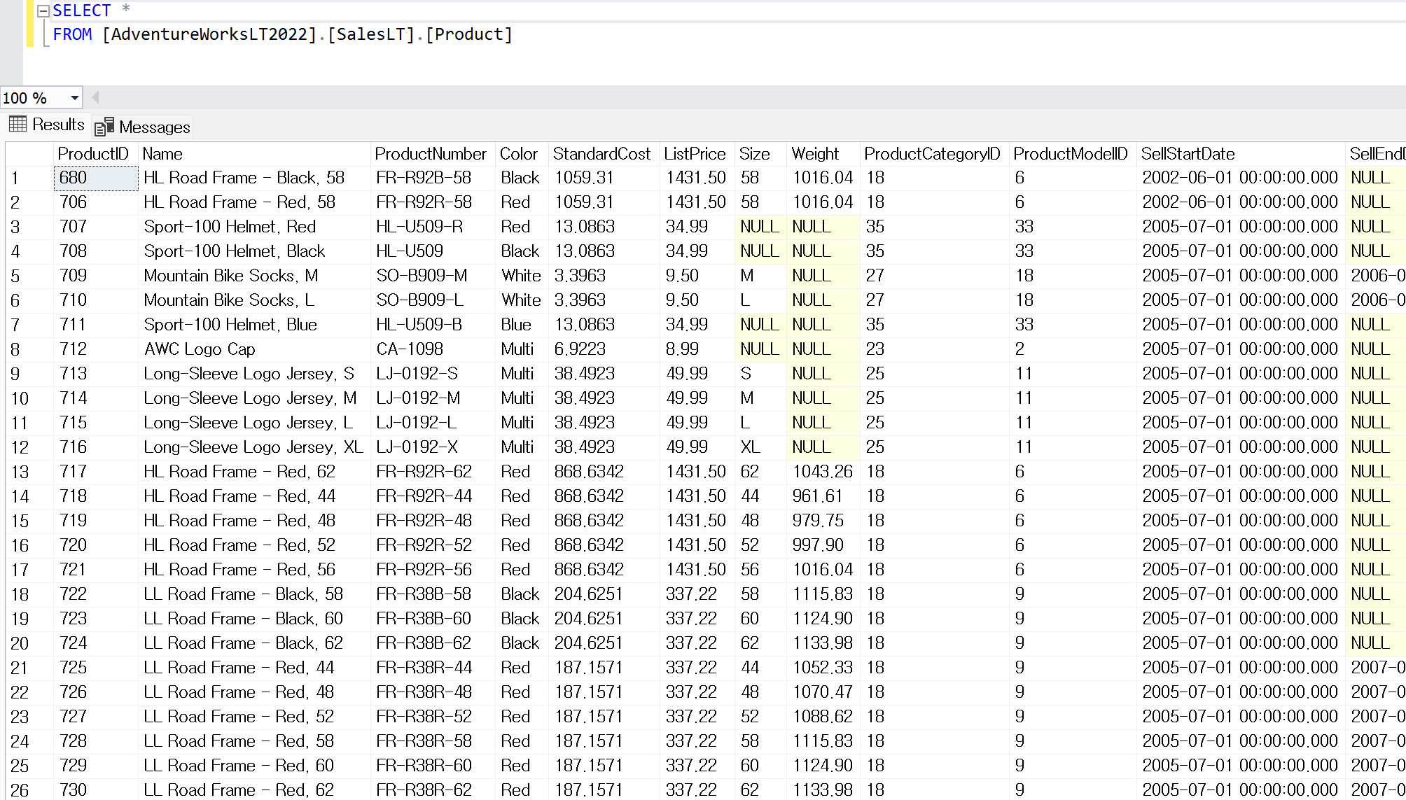 AdventureWorksLT2022 샘플데이터베이스로 테스트 해보겠습니다. select문으로 조회해보면 아래와 같이 Product테이블에 데이터가 있는 부분을 확인 할 수 있습니다.