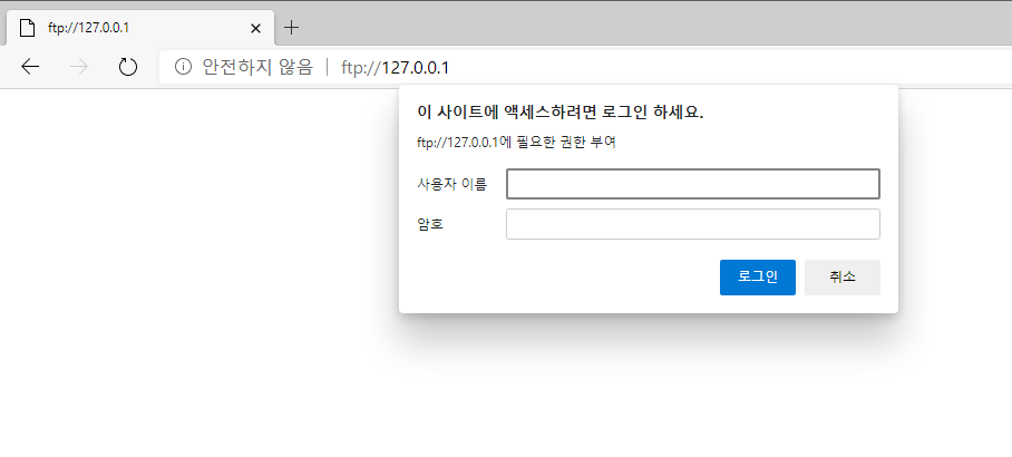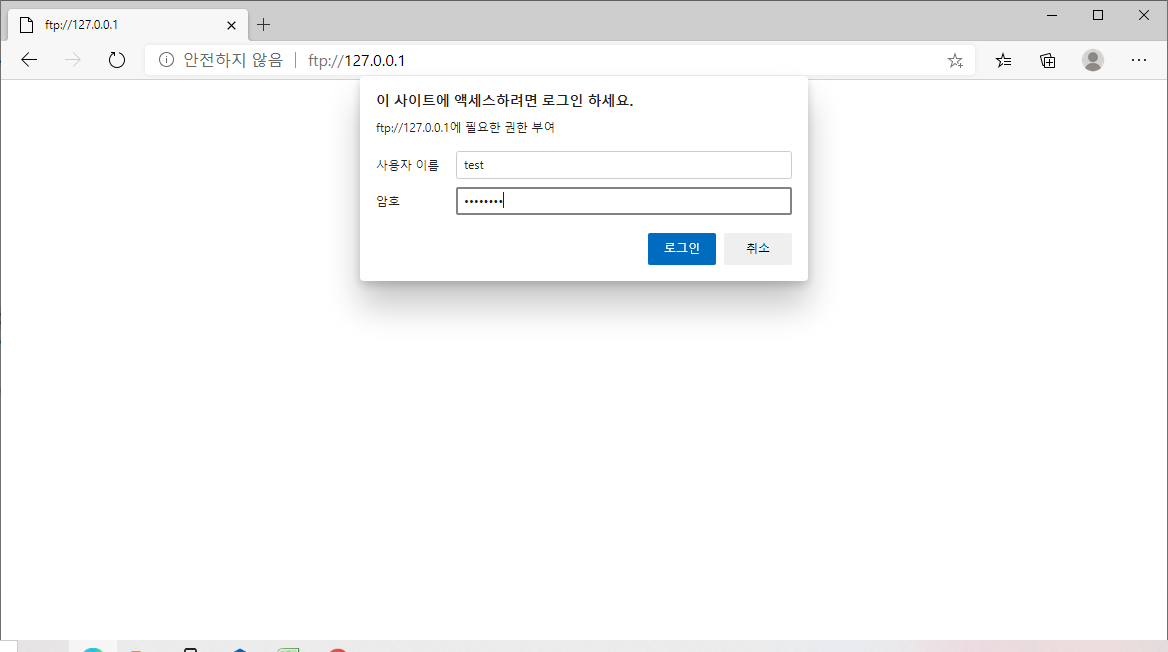 ftp://127.0.0.1 사이트에 접속하면 사용자이름/암호입력란이 나오면 해당부분에 아이디 : test , 비번은 설정한 비밀번호를 입력해서 접속합니다.