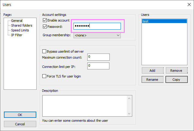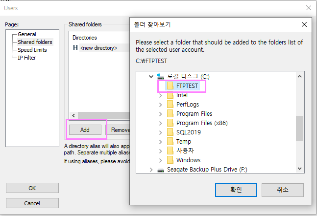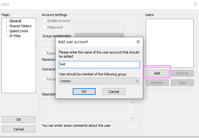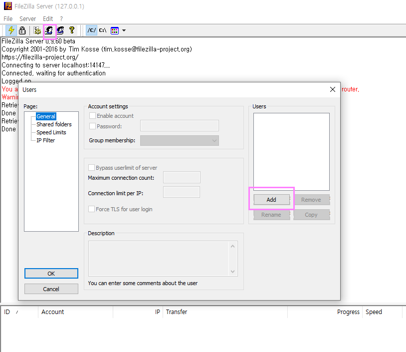 사람모양의 아이콘을 클릭하면 User화면이 나타납니다. 해당화면이 나타나면 Add버튼을 클릭하여 FTP접속계정을 등록해줍니다.