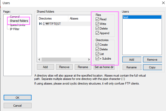 디렉토리권한 : Create(생성), Delete(삭제), List(리스트조회) , +Subdirs(하위디렉토리생성) 권한을 설정할수 있습니다.