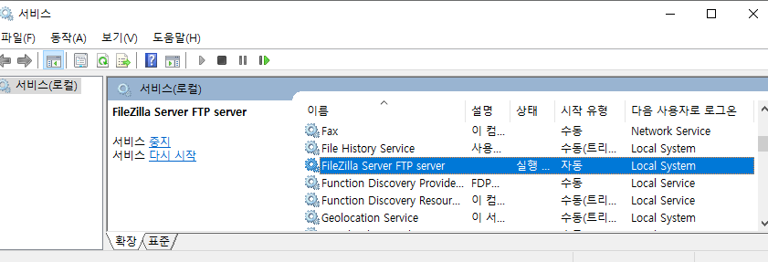 파일질라가 설치되면 서비스로 기동되면 서비스 시작/중지는 윈도우 서비스쪽에 FileZilla Server FTP server 항목에서 설정이 가능합니다.