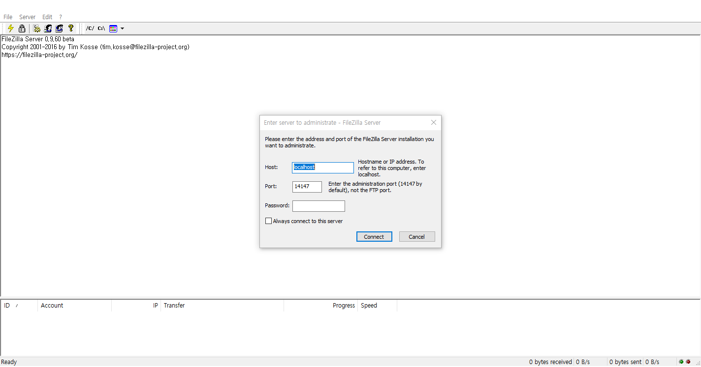 이제 설치가 완료되었습니다. 설치완료후에는 계정정보를 설정하면됩니다. 설치가 완료되면 바탕화면에 "FileZilla Server Interface" 아이콘이 나타나며 해당프로그램을 실행하면 아래와 같은 화면이 나타납니다. 기본설정포트가 14147이여서 해당부분을 그대로 두고 Connect버튼을 클릭하여 접속합니다.