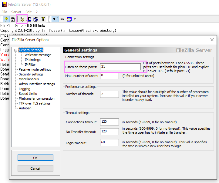 기본적으로 FTP서버는 21번포트를 사용하는데 포트번호를 변경하고 싶으면 Server Options메뉴에서 설정이 가능합니다. General Settings항목의 Listen on포트쪽부분에 포트번호를 변경하면됩니다.
