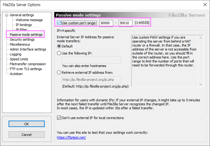 FTP모드의 경우는 Active모드와 Passvie모드가 있는데 Passive Mode사용시 임의로 1024 ~65535번포트를 사용하여 데이터 연결에 대한 포트가 지정되는데 방화벽을 사용할경우 모든포트를 열수없기때문에 임의 포트를 지정하여 연결이 필요한경우가 있습니다. 그럴경우에 아래 Passive mode settings항목에서 범위지정을 할수 있습니다.