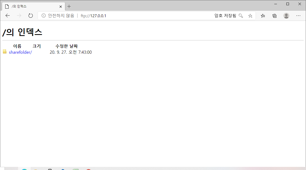 이제 파일질라 서버설치가 완료되었습니다. 그런 클라이언트에서 정상동작하는지 확인해보도록 하겠습니다. 웹브라우저에서 ftp프로토콜을 지원하기때문에 ftp접속 url을 입력해서 접속해보도록 하겠습니다.