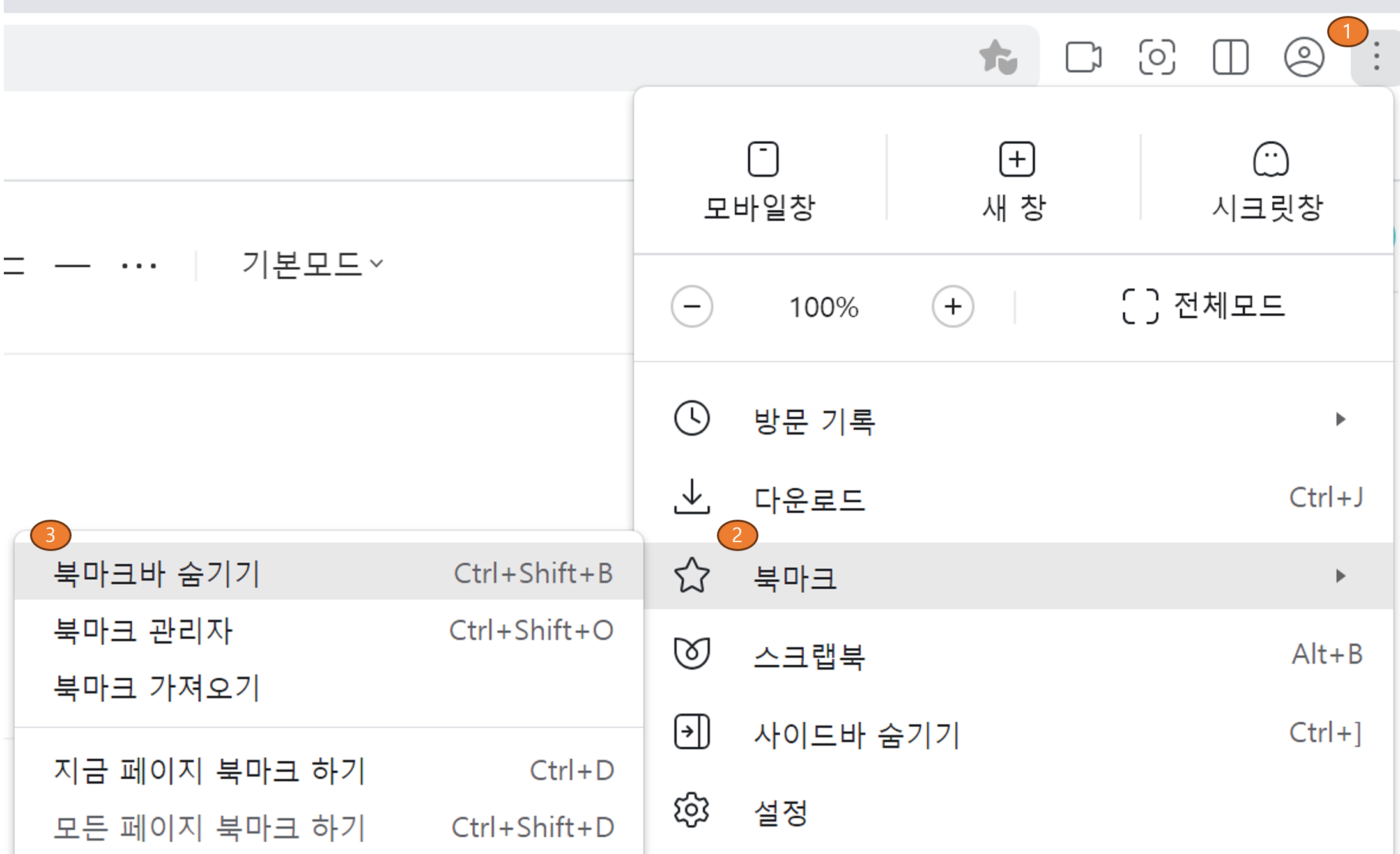 웨일 브라우저의 북마크 보이기/숨기기 설정 방법입니다.