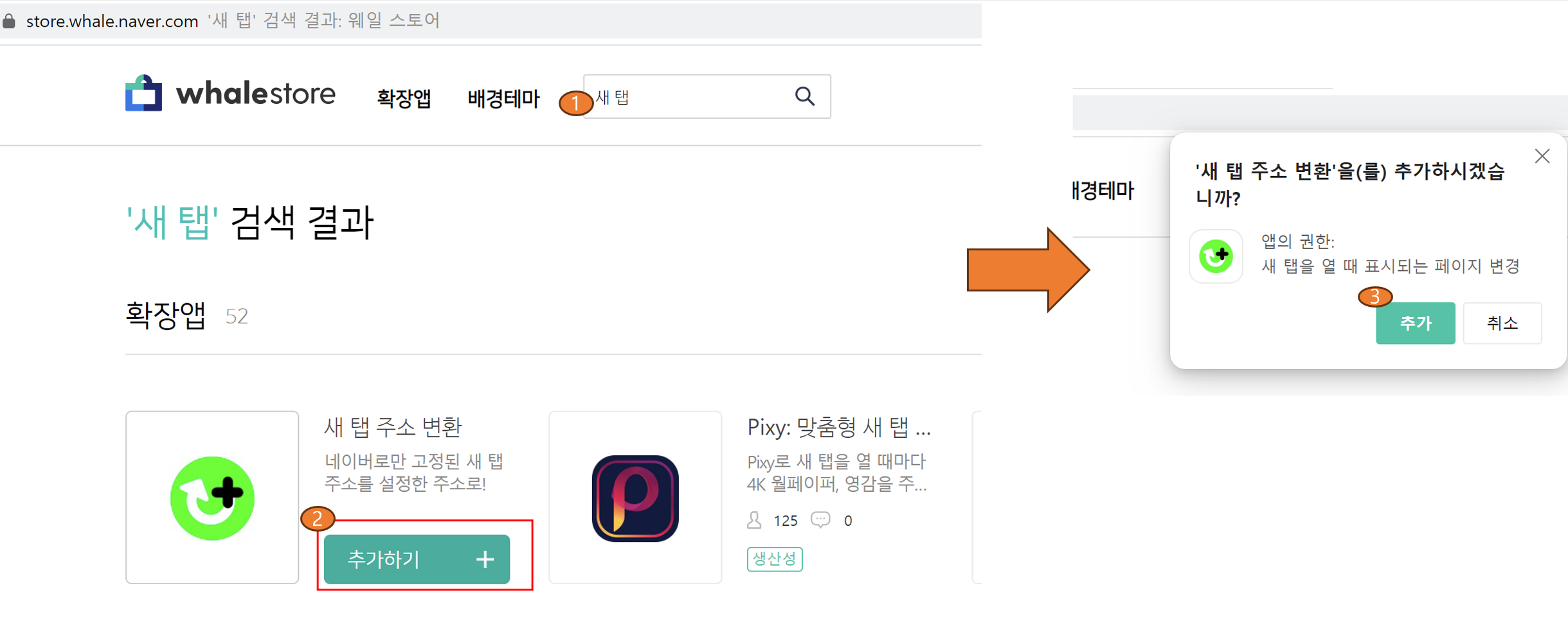 검색 항목에 "새 탭" 으로 검색 하면 새 탭 주소 변환 확장앱 메뉴가 나타나고 마우스 커서를 갖다데면 추가하기 버튼을 클릭합니다.