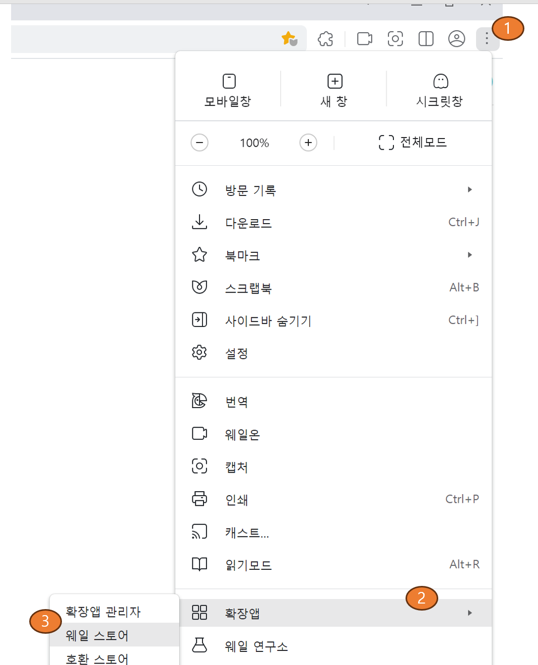웨일브라우저 설정에서 확장앱 메뉴의 웨일 스토어 항목을 클릭합니다.