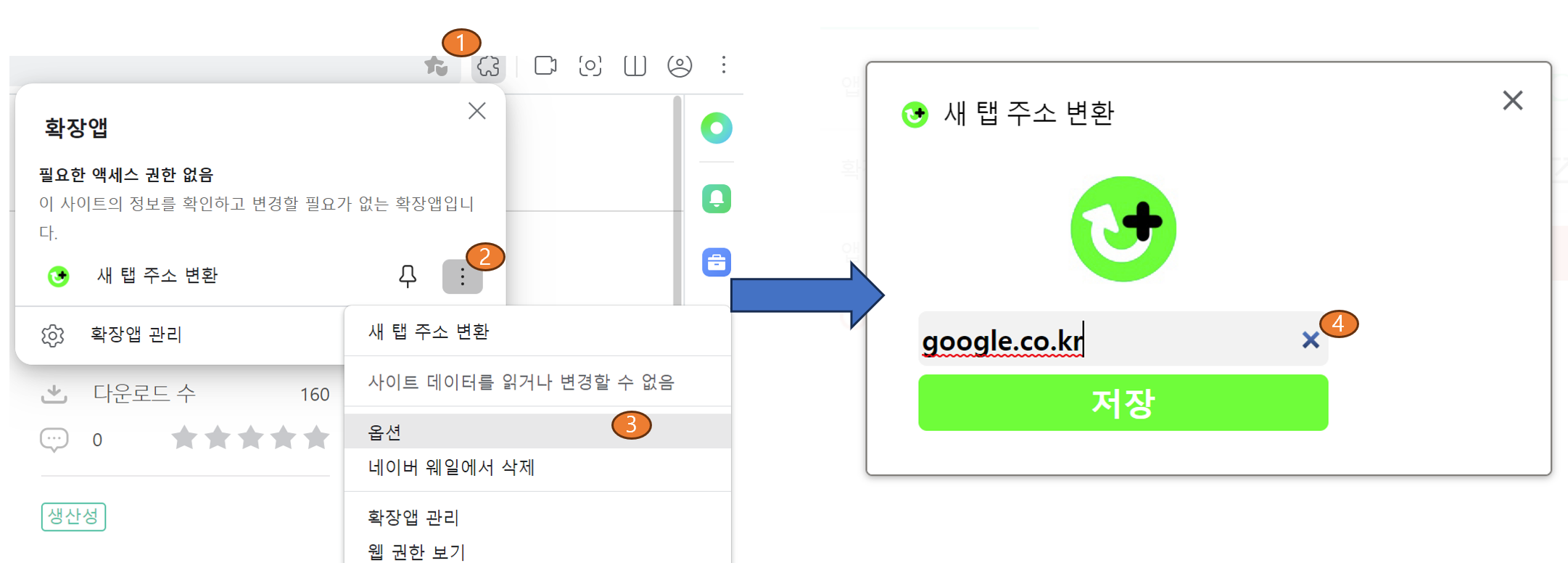 확장앱이 설치되면 오른쪽 상단의 ①확장앱 메뉴를 클릭 -> ②새 탭 주소변환 -> ③옵션 클릭 -> ④새 탭 주소변환 항목의 url정보를 입력 후 저장. 구글 google.co.kr로 설정 후 테스트 해보겠습니다.