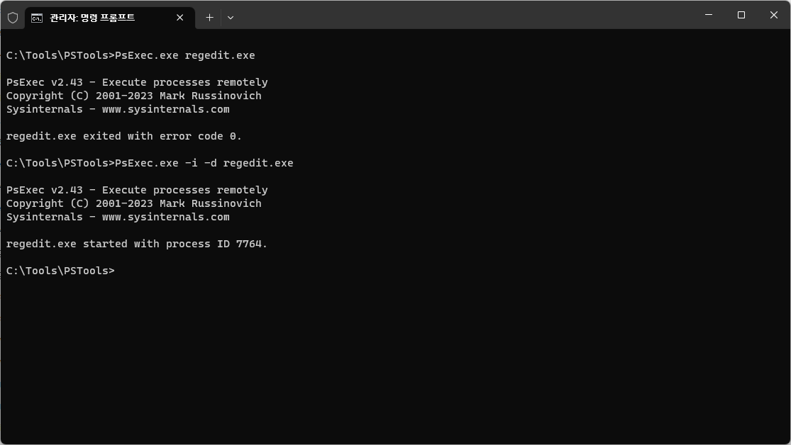 PsExec.exe /? 명령을 실행해보면 여러가지 옵션항목이 나오니 참고하시기 바랍니다.