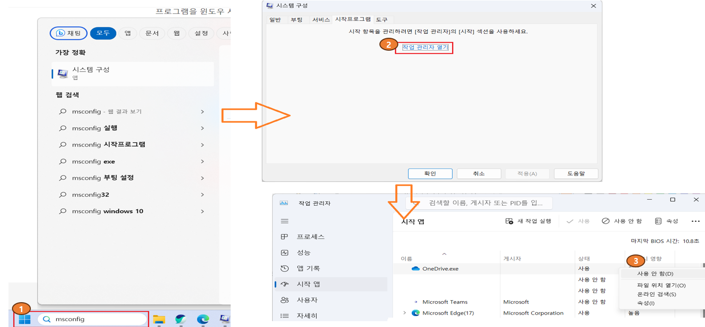 실행창에서 msconfig를 입력 -> 시스템 구성의 시작프로그램 탭에서 작업관리자 열기를 선택 -> 프로그램은 선택 후 마우스 오른쪽 버튼을 누른 후 사용/사용안함 선택합니다.