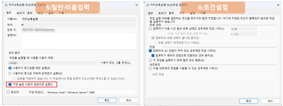 ⑤ 작업명입력 : 이름에 작업명을 입력합니다. 보안옵션은 가장 높은수준의 권한으로 실행을 선택합니다.