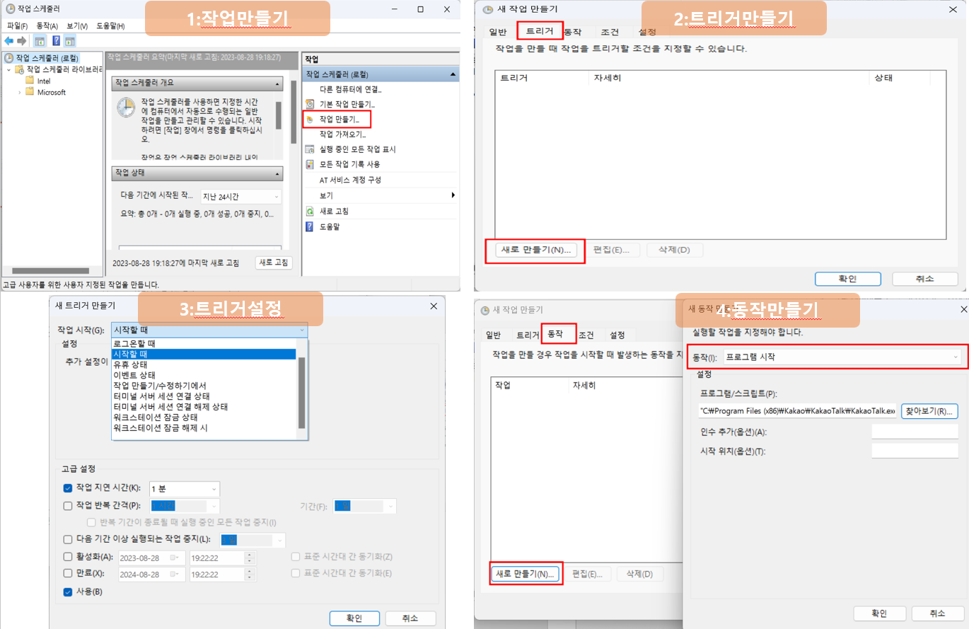 ③트리거설정 : 작업시작 항목을 시작할때를 선택합니다. 작업 지연시간을 설정하여 지연시간을 설정가능합니다.