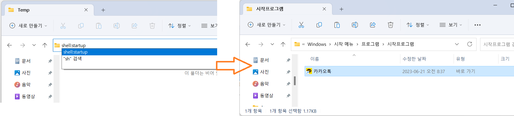 탐색기에서 shell:startup명령을 입력 후 엔터를 클릭하면 시작프로그램 메뉴가 나타납니다. 등록하고 싶은 프로그램의 바로가기를 복사해 넣으면 해당 프로그램이 자동 실행됩니다.