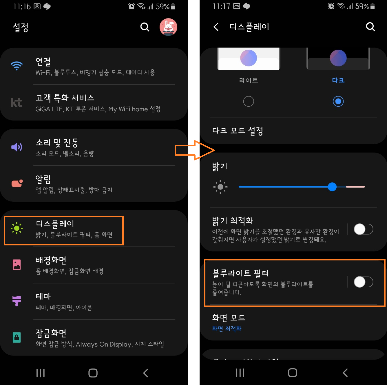 3. 블루라이터 필더 적용 전/후 화면 비교