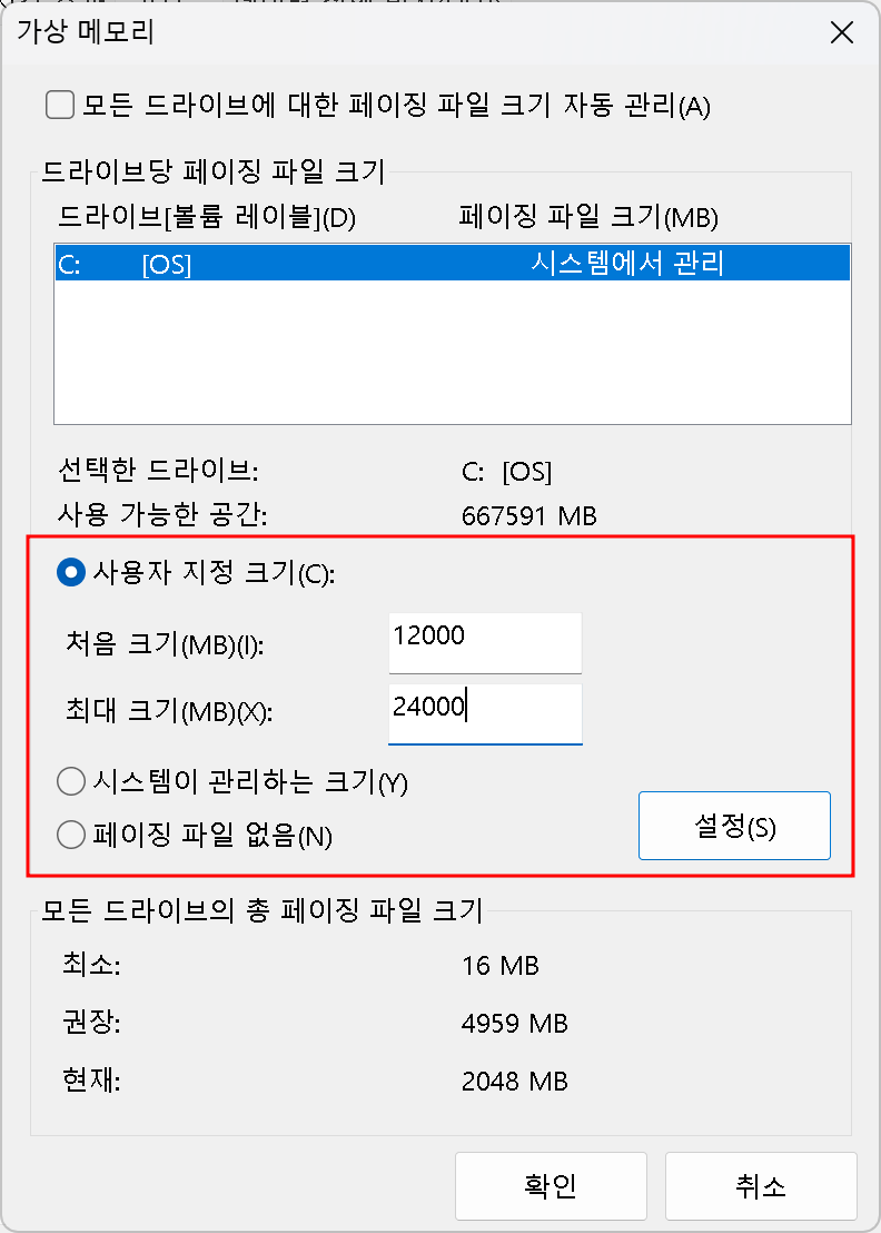 메모리가 여유가 있는 경우는 페이징 자동관리로 두고 별도로 설정이 필요 하지 않습니다. 메모리가 부족할 경우 가상메모리를 수동으로 늘릴 경우에는 저 같은 경우는 처음크기는 1.5배 , 최대는 3배로 설정을 하고 있습니다. 실제 RAM이 8G인 경우는 최소 12G, 최대는 24G로 설정을 하여 메모리 부족에 대한 부분을 해결 하고 있습니다.