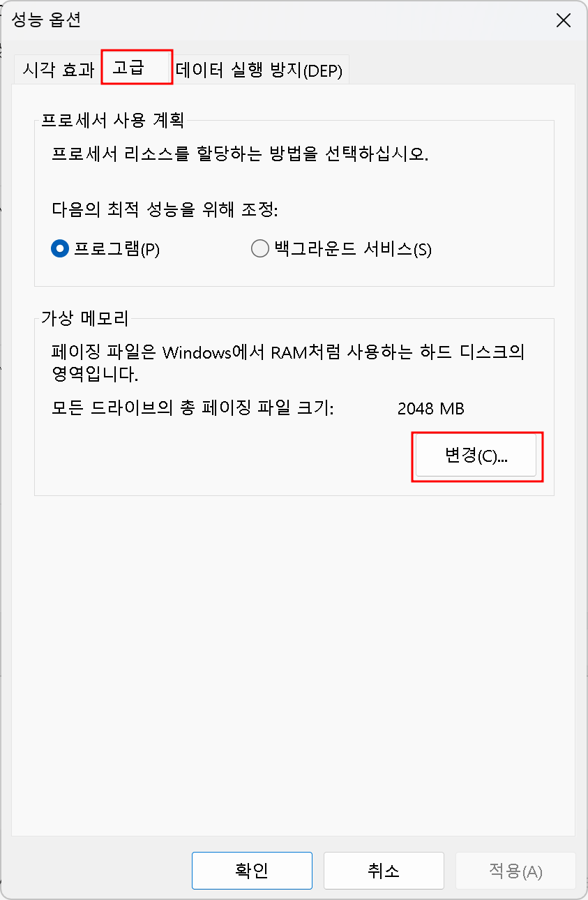윈도우 기본 가상메모리 설정은 자동관리로 되어있습니다. 설정은 아래와 같이 확인이 가능합니다.