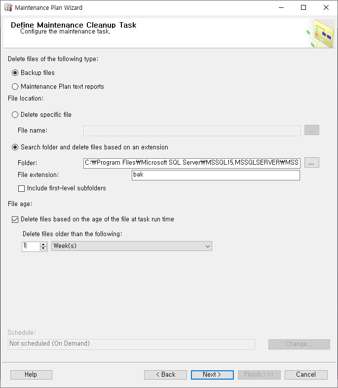 트랙잰션 로그백업시 주의사항. File extenstion 항목에 bak파일입력. 오래된파일 삭제(Delete files based on the...)할지 유무를 선택하여 1주일단위소 삭제하도록 하겠습니다.